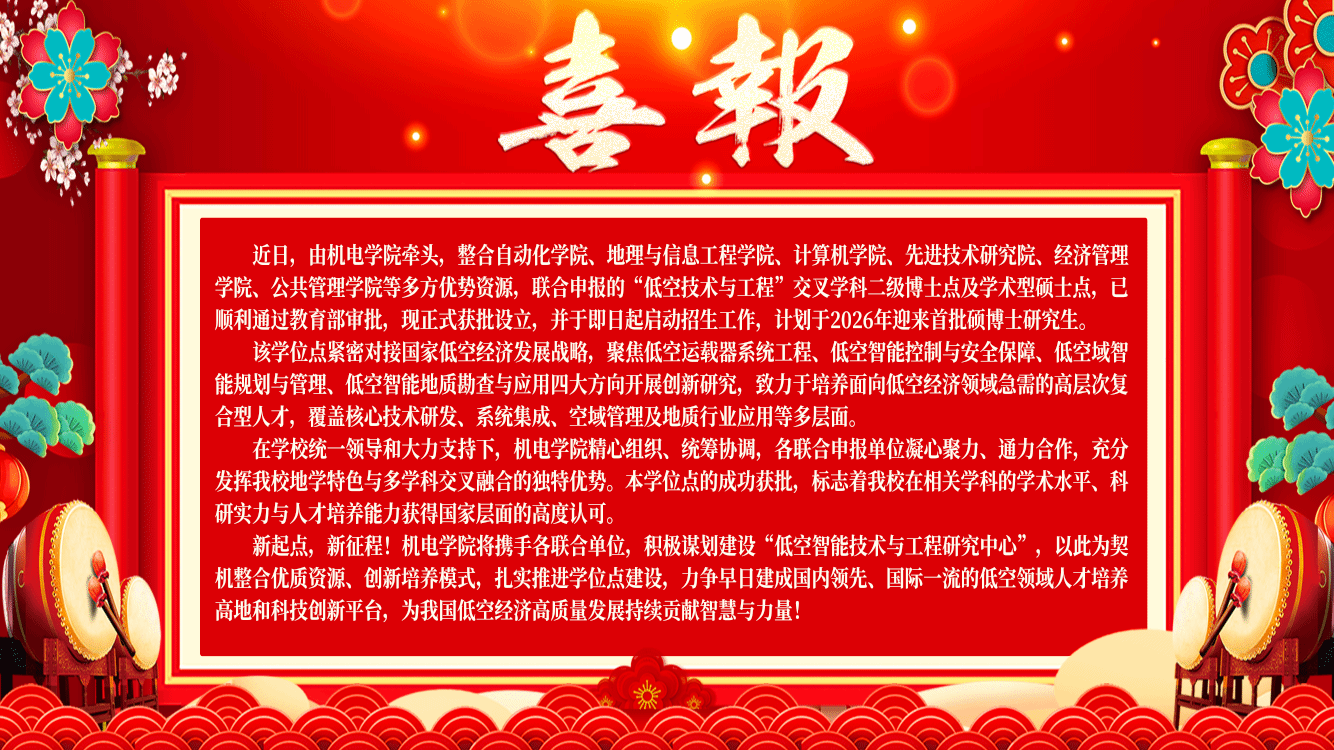 查看详情近日,由机电学院牵头,整合自动化学院、地理与信息工程学院、计算机学院、先进技术研究院、经济管理学院、公共管理学院等多方优势资源,联合申报的“低空技术与工程”交叉学科二级博士点及学术型硕士点,已顺利通过教育部审批,现正式获批设立,并于即日起启动招生…
