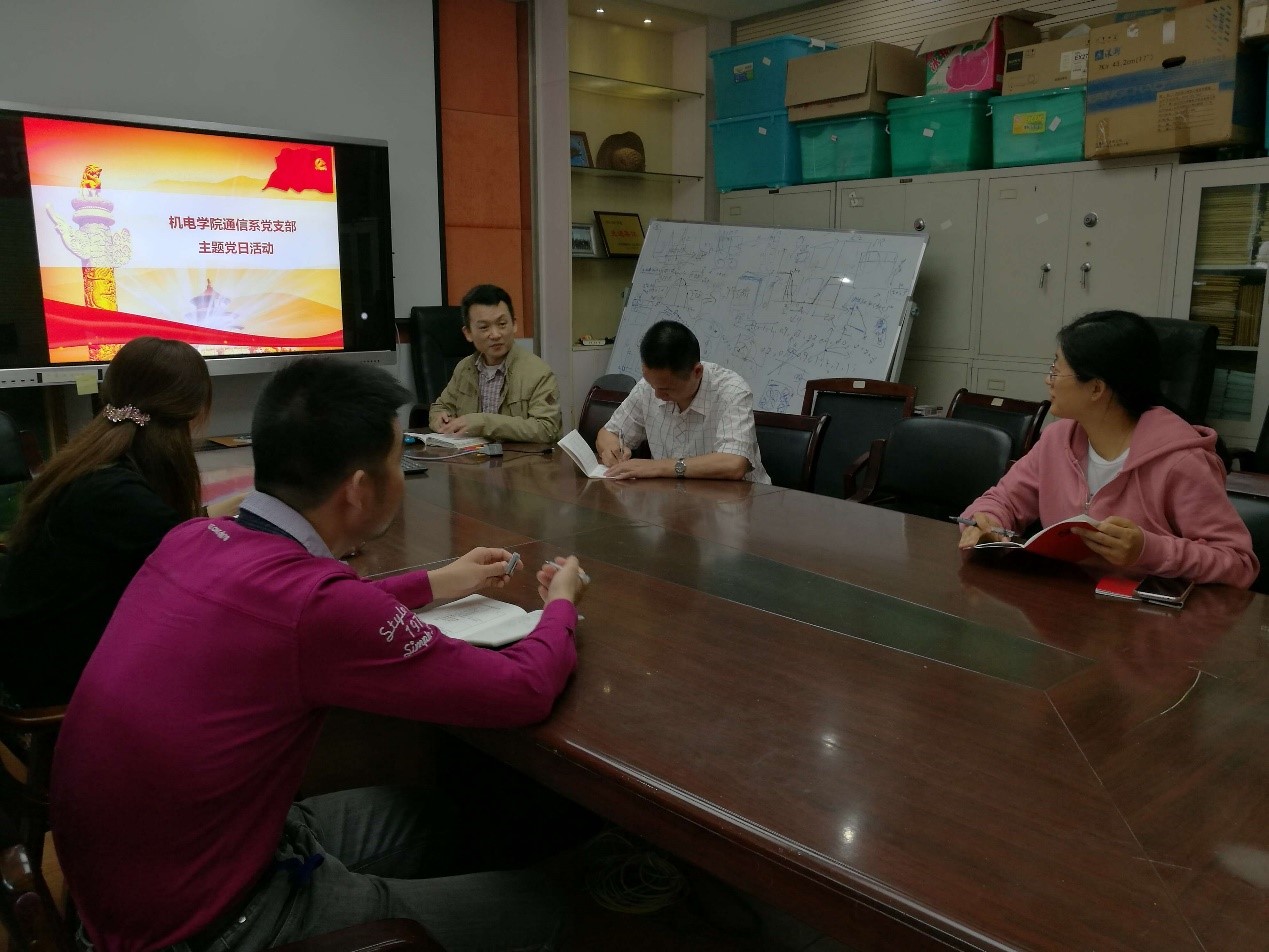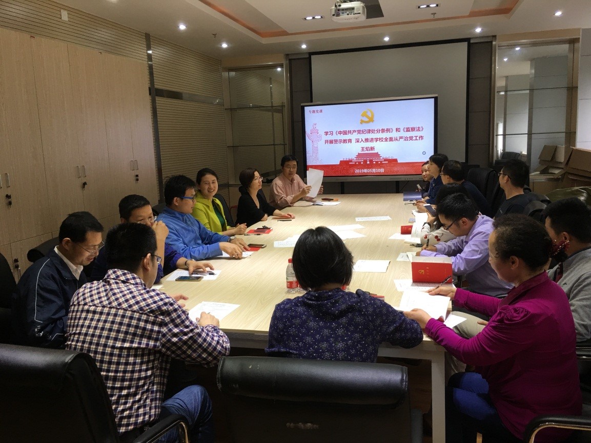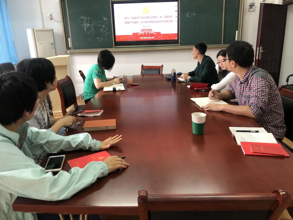 各党支部组织党员开展主题党日活动,学习《中国共产党纪律处分条例》、《中华人民共和国监察法》、《湖北高校”支部建设年”方案》、《湖北高校党支部规范化建设试点工作方案》、《党政领导干部选拔任用工作条例》,同时学习了习近平总书记在纪念五四运动100周年大会上的讲话精神,并展开了热烈讨论。