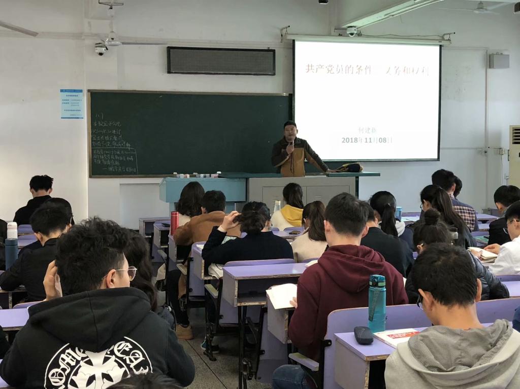(通讯员:杜育、黄梅娇、黄瑞杰)2018年11月8日下午4点,免费av影片分党校第二十六期入党积极分子培训班第六讲在教三楼401进行。本次课程的主题是《共产党员的条件、义务和权利》,自动化学院党委副书记何建新老师担任主讲。