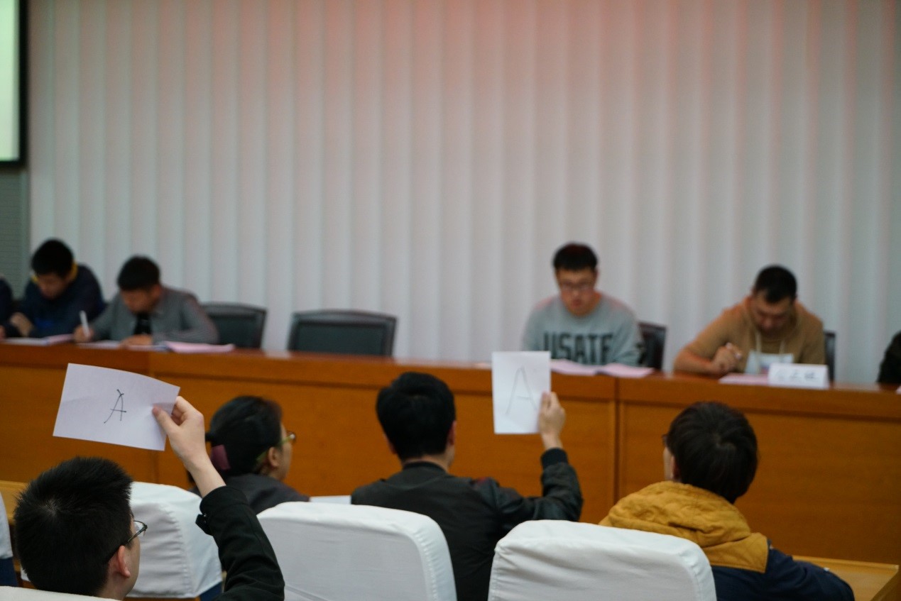 决赛形式为现场答题,答题环节分为小试牛刀、风险关口、争分夺秒,按三个环节得分总和决出前三甲。为保证比赛的公正公平,本次决赛邀请了学院辅导员丁钰峰老师、买买提·艾尔肯老师、院研究生会陈霖、院学生党建办公室黄仕恒组成比赛的公正组。决赛赛场气氛激烈,各参赛队伍你追我赶、互不相让,经过前两个环节的比拼,各队成绩不分伯仲,可见选手们对相关知识学习充分、掌握牢靠。