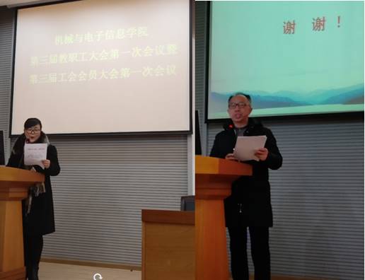 (以下简称机电学院)第三届教职工大会第一次会议暨第三届工会会员大会第一次会议在教二楼301会堂隆重召开。校工会于荣萍副主席及机电学院全体教职工与会,会议由机电学院党委副书记于晓舟同志主持。