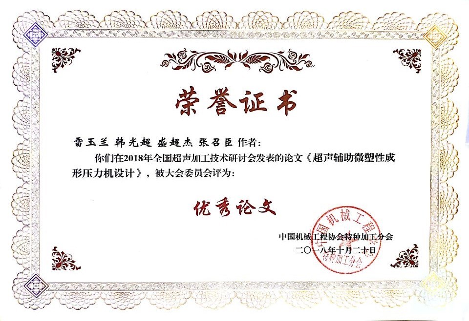 机电学院机械工程系韩光超老师和雷玉兰硕士研究生参加了本次会议,雷玉兰在大会作了题目为《超声微塑性成形压力机设计》的大会报告,并获得了大会颁发的优秀论文奖。