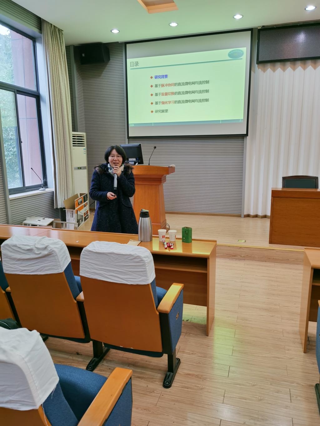 报告主要介绍了直流微网中分布式电源的协同控制。直流微网是能源互联网的一类基本组成单元,其中通常包含多种类型的供电单元,如何使多能源协同实现经济可靠的供电,提高供电质量,是直流微网研究的一个关键问题,相关研究在智能楼宇、船舶等场景中具有重要的应用价值。王燕舞教授团队提出的三种方案均实现均流调控和总线电压调控:针对系统模型参数已知的情况,基于混杂系统理论,结合异构多智能体协同控制思想,提出了基于离散信息交互策略的协同控制方案;基于切换控制思想,提出了监督切换均流控制器;对于系统模型参数无法准确获得的情况,建立了基于强化学习的协同控制方案。