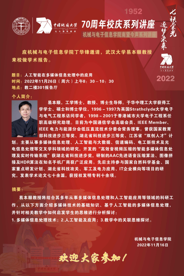 【11月26日】校庆系列学术活动---机电讲坛(2022-31):武汉大学易本顺教授