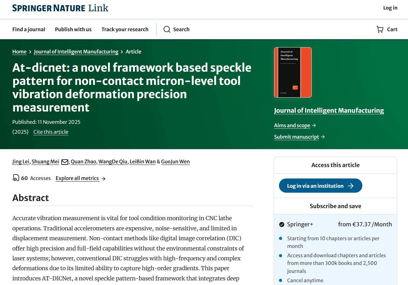 近日,免费av影片梅爽教授、文国军教授科研团队在制造装备监测领域取得重要进展,成功研发基于数字图像相关(DIC)的非接触式刀具振动变形高精度测量系统。相关成果“AT-DICNet: A Novel Framework based on Speckle Pattern for Non-contact Micron-level Tool Vibration Deformation Precision Measurement”发表于国际权威期刊《Journal of Intelligent Manufacturing》,该论文第一作者为2022级研究生雷靖,梅爽教授为通讯作者。