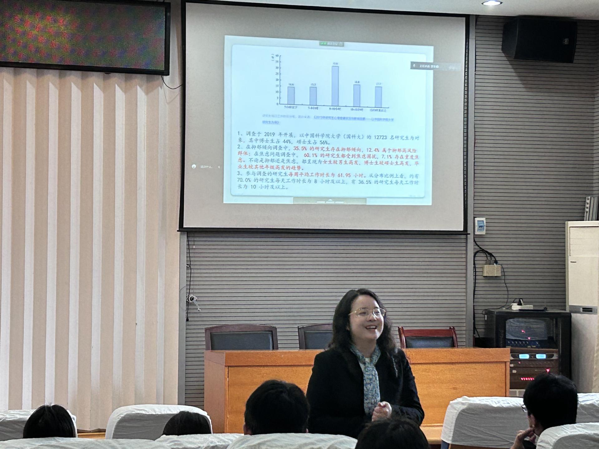讲座中周春燕通过调研的数据分析,当下研究生的焦虑水平超过普通人群,大部分研究生关注自己的专业发展前景,繁重的学业压力、就业压力与人际关系压力等都是研究生的压力来源。同时结合开场测试压力量表的各个得分区间,让同学们了解自己的压力水平,了解自己的心理健康状态。