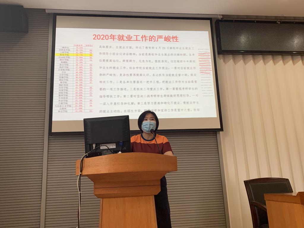 党委副书记于晓舟随后对2020届毕业生就业工作的重要性、严峻性、紧迫性做了重点强调,并再一次解读了学校《关于切实加强2020届毕业生就业工作的通知》文件精神。她强调就业工作事关民生改善,事关社会和谐稳定,事关学院发展全局。毕业就业是学生的大事,也是学院人才培养、向社会输送的大事、更是我们老师的职责担当。希望所有老师利用当前求职就业黄金时间,加快工作推动步伐,针对性的帮助未就业学生解决其就业困难,一起迎战“史上最难就业年”。