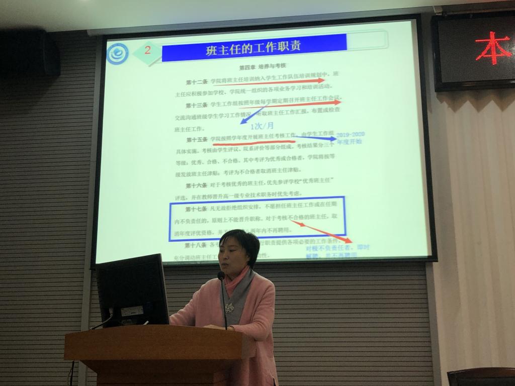 大会开始,于晓舟在报告中分三点阐述班主任工作。她强调了班主任工作的重要性与必要性,指出大学班主任是高校思想政治教育的基本队伍,是教书育人的典范,更是协调各种教育力量的桥梁和纽带,也是班集体的设计、组织、管理和教育人员。同时她强调班主任的工作职能,即在学生的思政教育和价值引领作为一个引路人,在班级的学风建设以及学生的就业指导上成为学生的支撑力量,更是学生心理健康发展的倾诉者。于晓舟最后给各位班主任提出了建议,班主任应对学生成才成长的目标提出要求和规划,并在班级学风建设和学生道德建设提出了明确的做法。