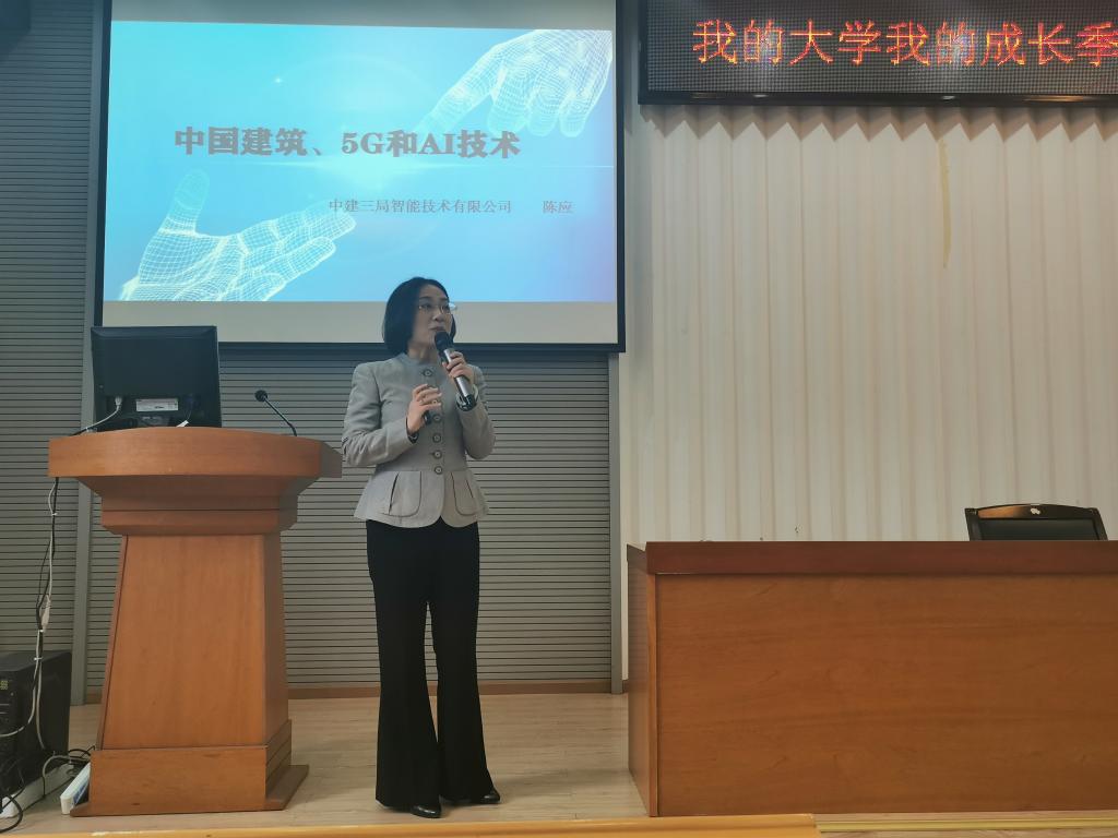 陈应以《中国建筑、5GAI技术》为题,向同学们介绍了中国建筑在智能建造、智慧城市等领域的新技术、新发展,并着重向同学们讲解了5G的关键技术和应用案例、5G在智能建筑中的运用、人工智能技术及人工智能技术在智能建筑中的运用。同时,她以武汉长江新城为例,介绍了智慧城市建设中的核心技术。最后,她结合自己二十多年的工作经历,与同学们分享了八点青年领导者需要具备的素养:一是对国家、企业、朋友忠诚;二是具有高度的责任心;三是博览群书;四是具备超凡的学习力;五是具有良好的沟通交流能力;六是脚踏实地的工作;七是常怀感恩之心;八是永葆激情。