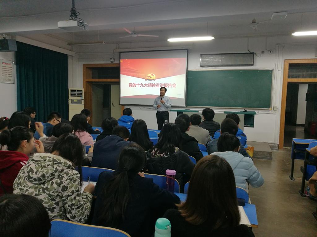 (通讯员 胡畔)11月28日晚,免费av影片全体学生党员在教一楼205开展党的十九大精神学习活动。本次学习活动邀请到武汉市招商局副局长胡何宇同志担任主讲嘉宾。